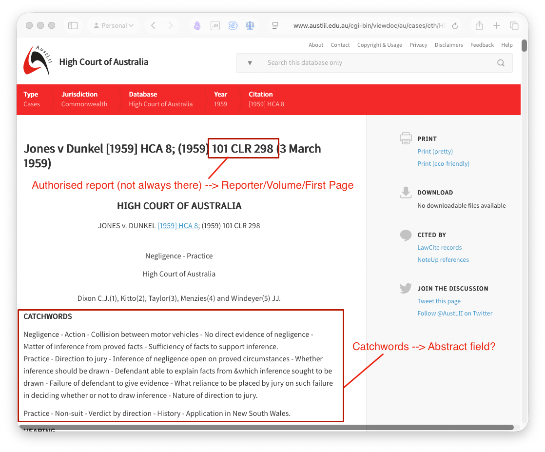 I'm curious if there are any other fields that can be pulled from an Austlii case page? I thought it might be handy (for example) to drop the catchwords into Zotero's 'Abstract' field.
