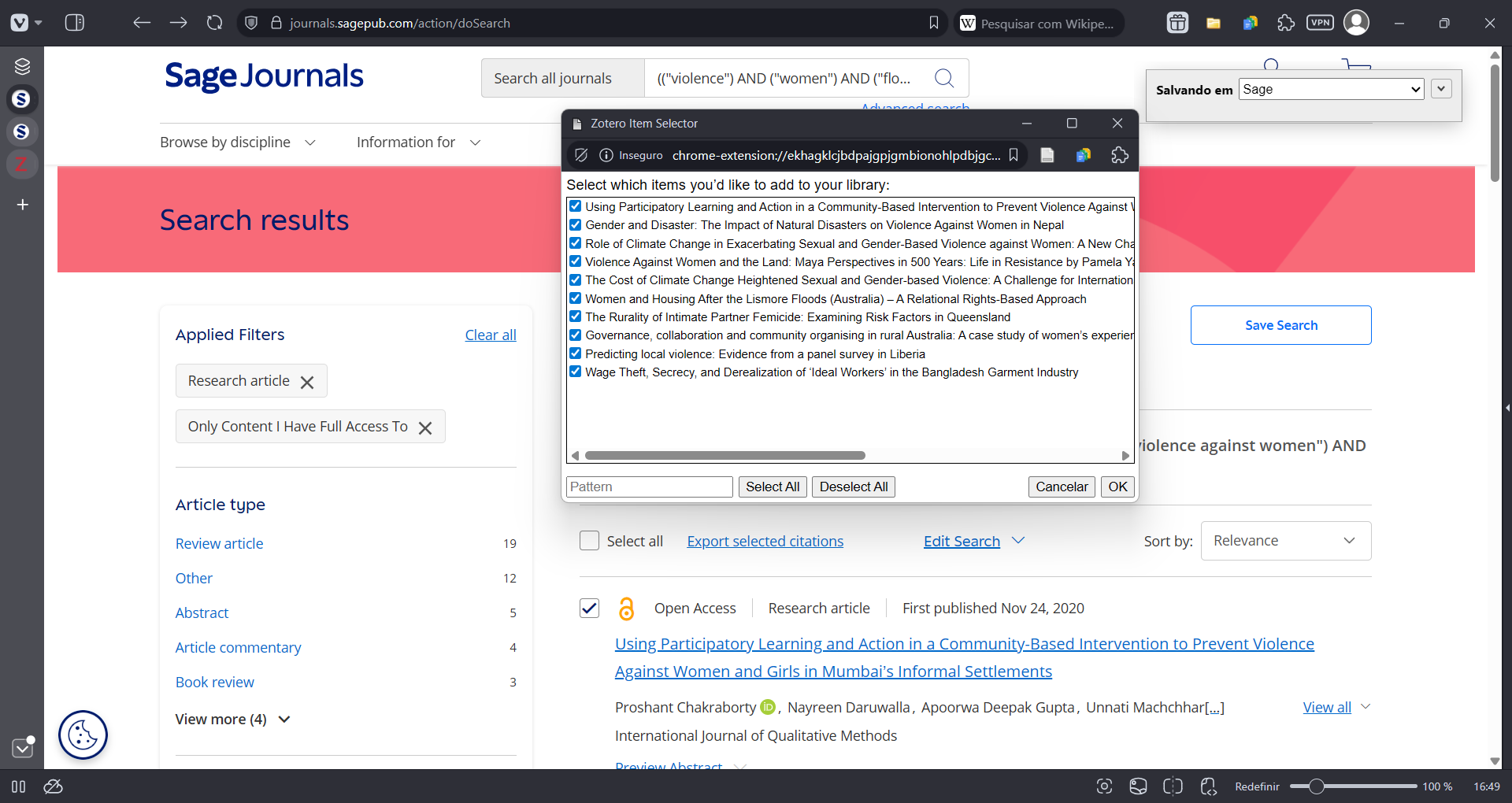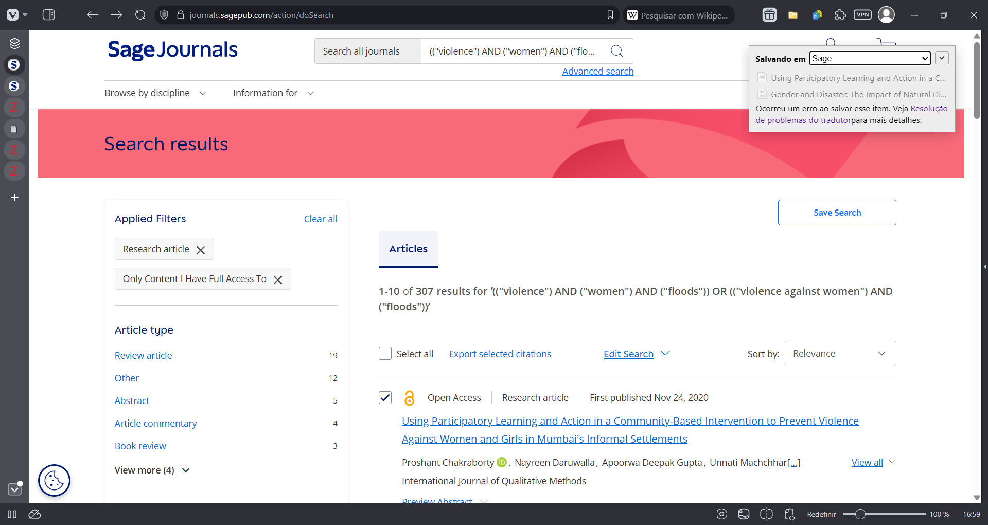 I'm trying to send some results from Sage Journals to Zotero, but I've been getting the translation error since the first couple of tries. I get to the selection/checklist screen, but as soon as it starts saving the results, I get the translation error. The search URL is: