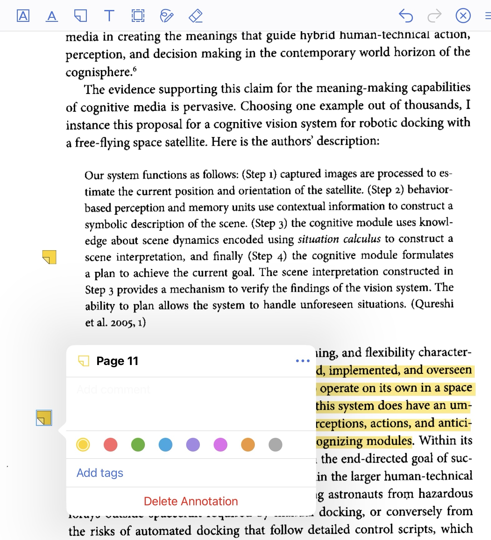 In this example, I can read the indented citation but not anything in the paragraph following it. I don't always use the highlight function to annotate. In this case, I only use the annotation (post-it) tool. Since the annotation needs to be close to the part of the text I am paraphrasing, being able to move the popover bubble would be good.