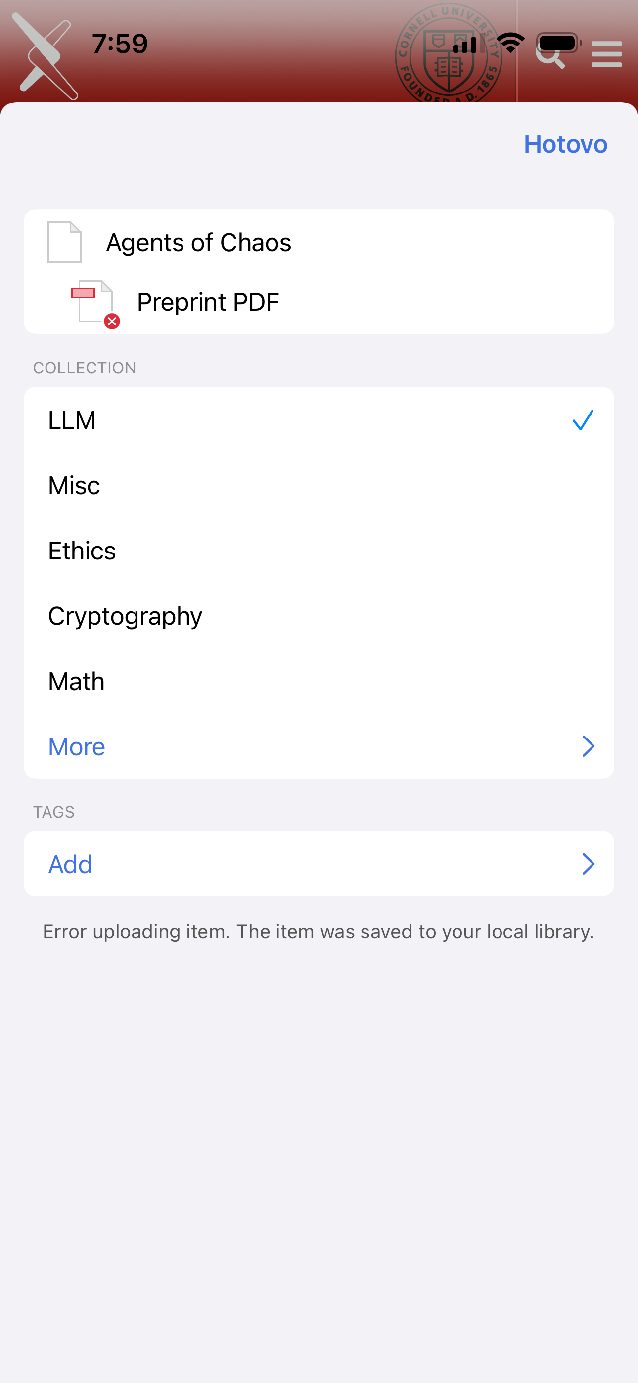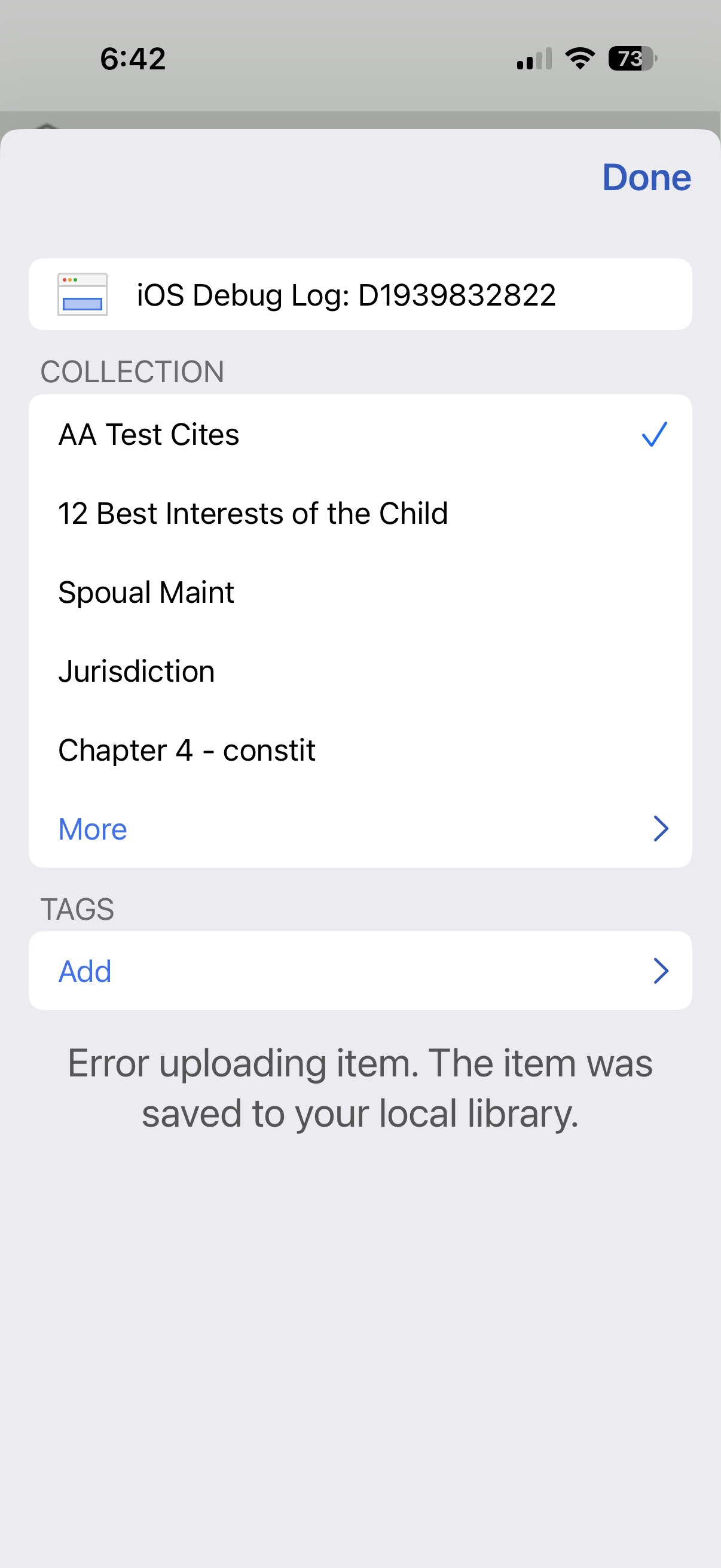 I can’t upload papers from iOS app to Zotero. I noticed it yesterday after linking with Overleaf (mentioning just in case there might be a connection).