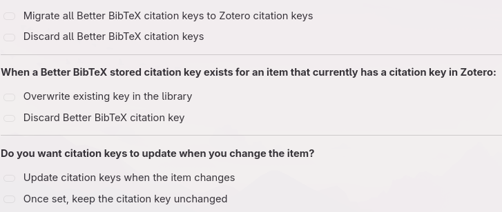 The prompt that's appearing about migrating citation keys is very confusing. First of all, it seems there's a bug on the linux app where when you click the options, nothing happens. It's unclear whether they're supposed to be check boxes (i.e. select multiple or none) or radio buttons (i.e. select one).
